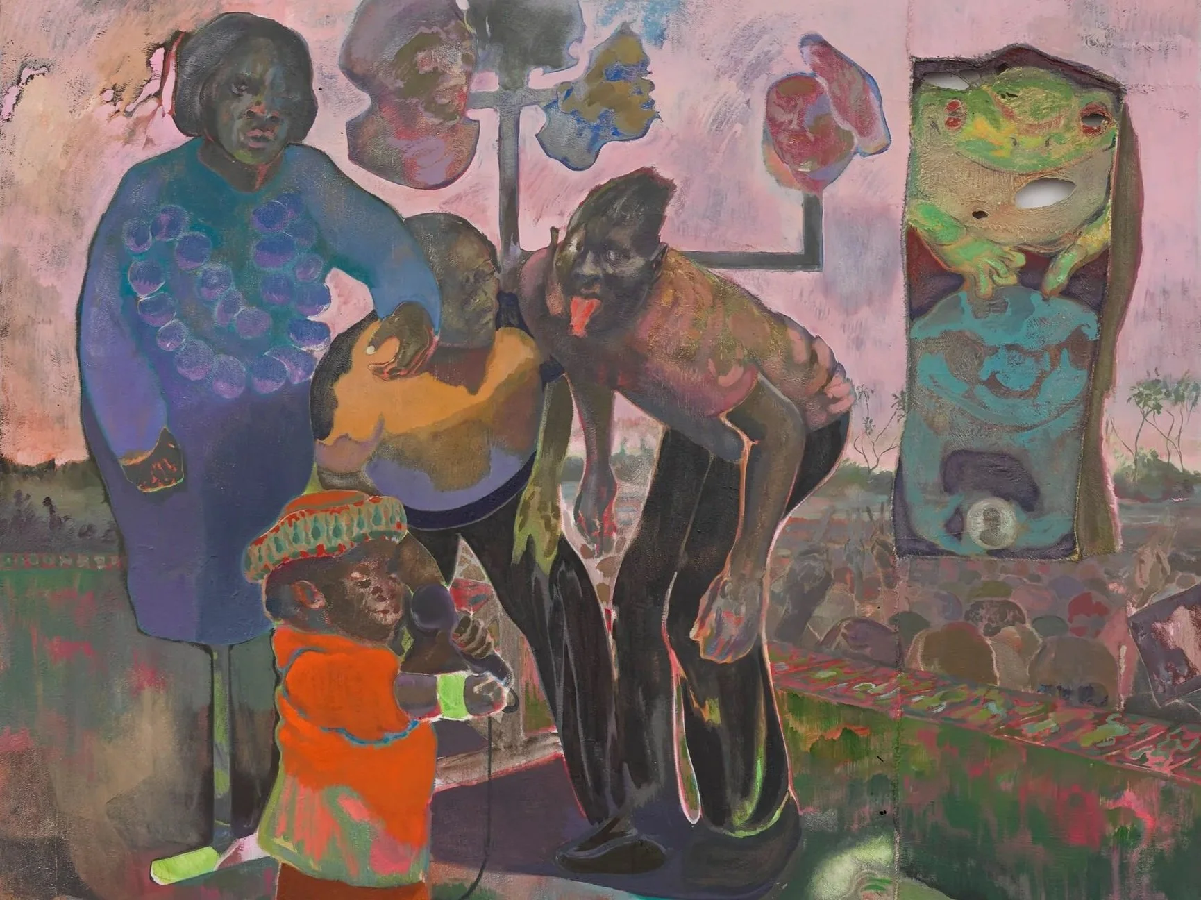 Michael Armitage, The promise of change, 2018, oil on Lubugo bark cloth, 220 x 240 cm.