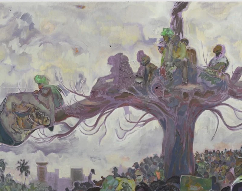 A tree rises from a sea of heads, with the skyscrapers of Nairobi in the distance. On its bare branches sit a number of people, some wearing green wigs and one carrying a banner with a frog painted on it. As in The Promise of Change, the frog symbolises Kenya’s political leaders who make meaningless promises to win votes.