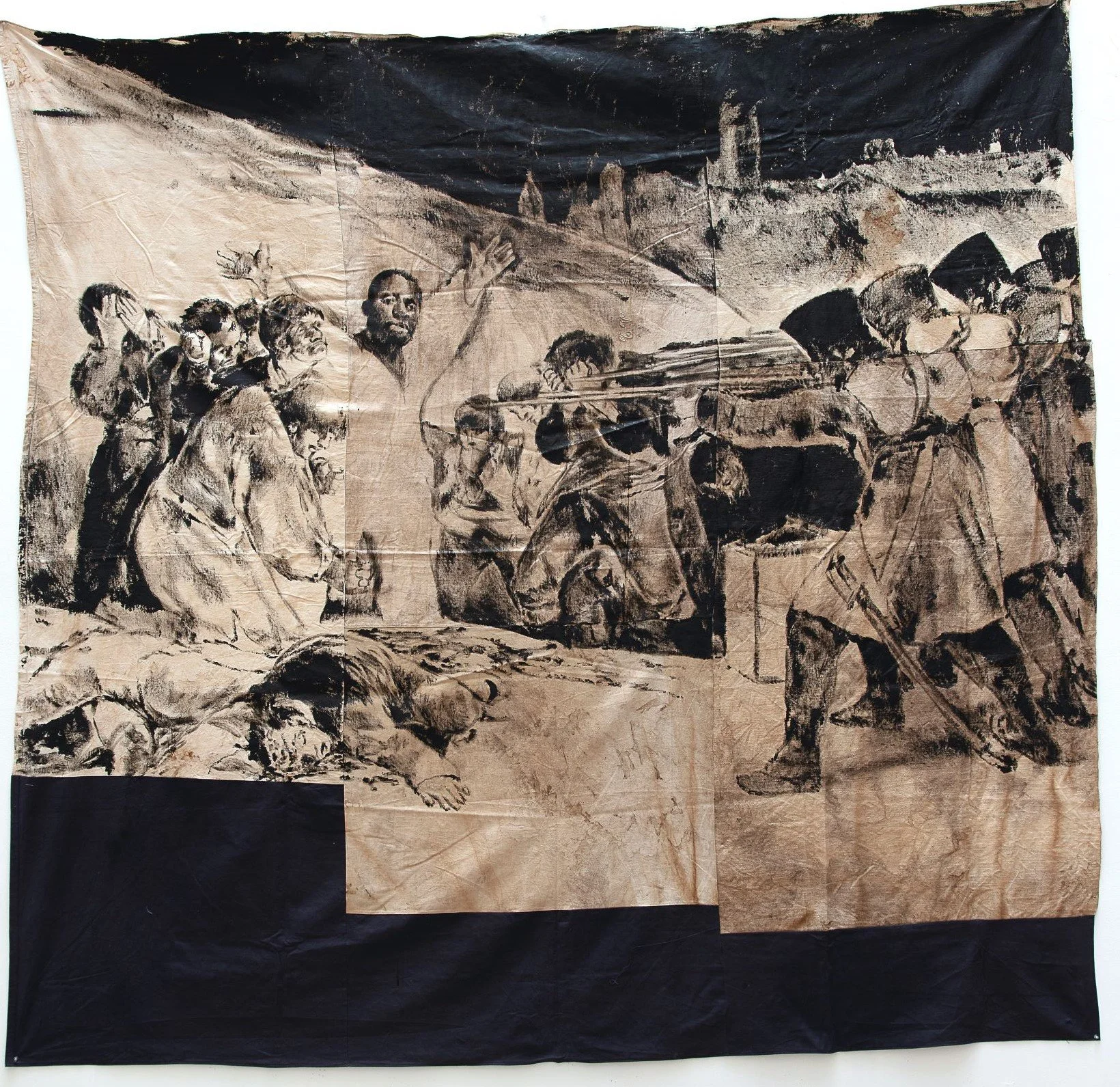 Mivekannin’s reversioning of Goya’s painting recalls the influential French painter Édouard Manet’s use of it as the model for five works on The Execution of Emperor Maximilian which he produced between 1867 and 1869.