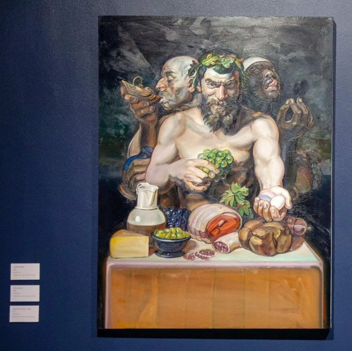 Porch Resolution contrasts the excess of food available to the rich in the global North with the life-and-death issue which is lack of it for many Africans. Phokela references Pieter Paul Rubens’ painting Two Satyrs (1617-19), with its table laden with meat, cheese, fruit and bread, adding a Black African with his tongue hanging out and his hand raised in a pleading gesture.