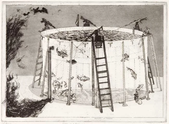 The fish swimming in this pool are blissfully unaware of the automatic rifles aimed down at them. Victor is riffing on the saying “shooting fish in a barrel” - meaning something that is very easy to do. The print is clearly a metaphor for how vulnerable we are to violence, and how it affects us indiscriminately.